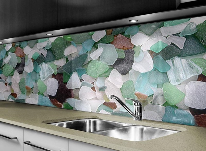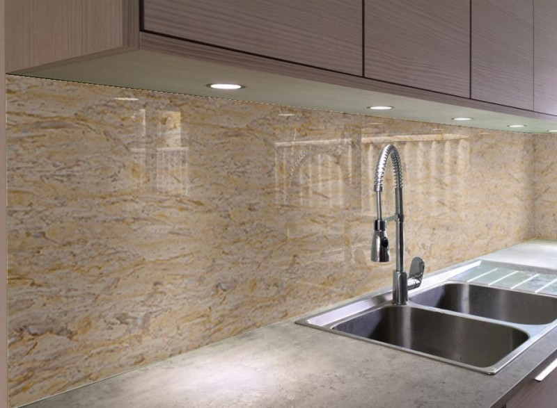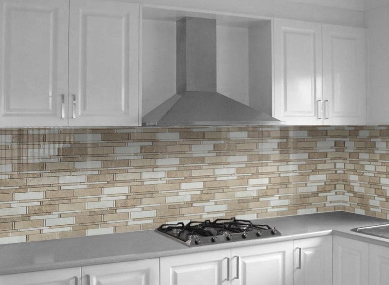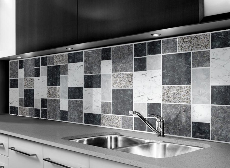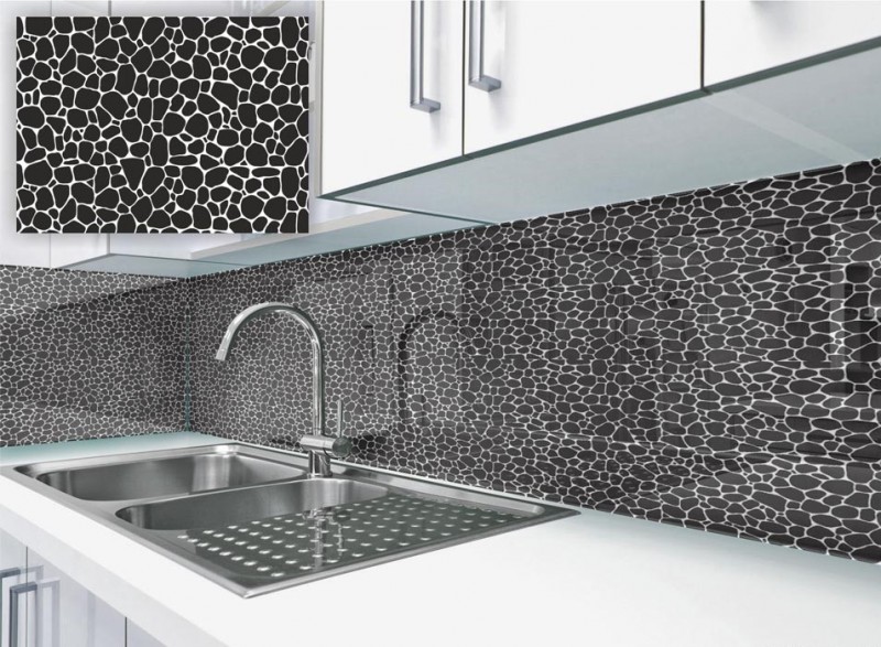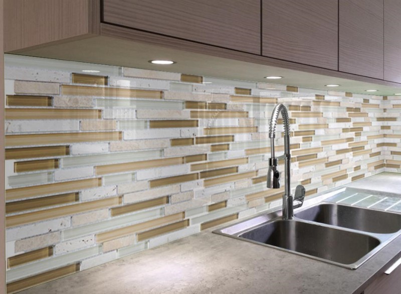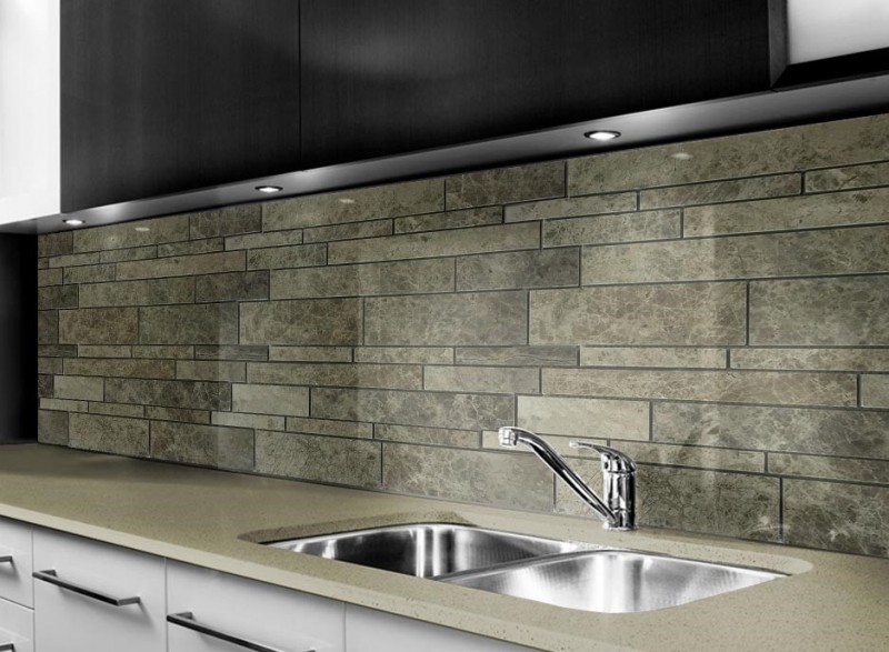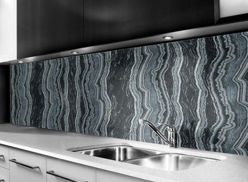 Skleněné obklady s imitací kamene jsou krásným moderním doplňkem každé kuchyně.