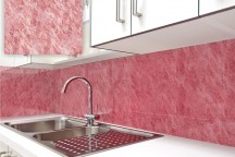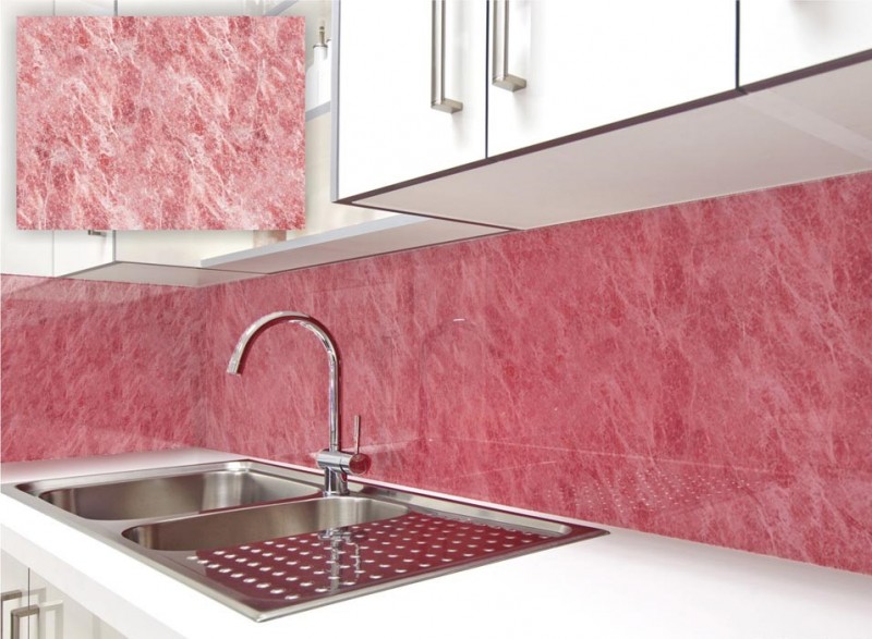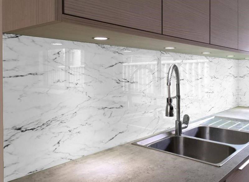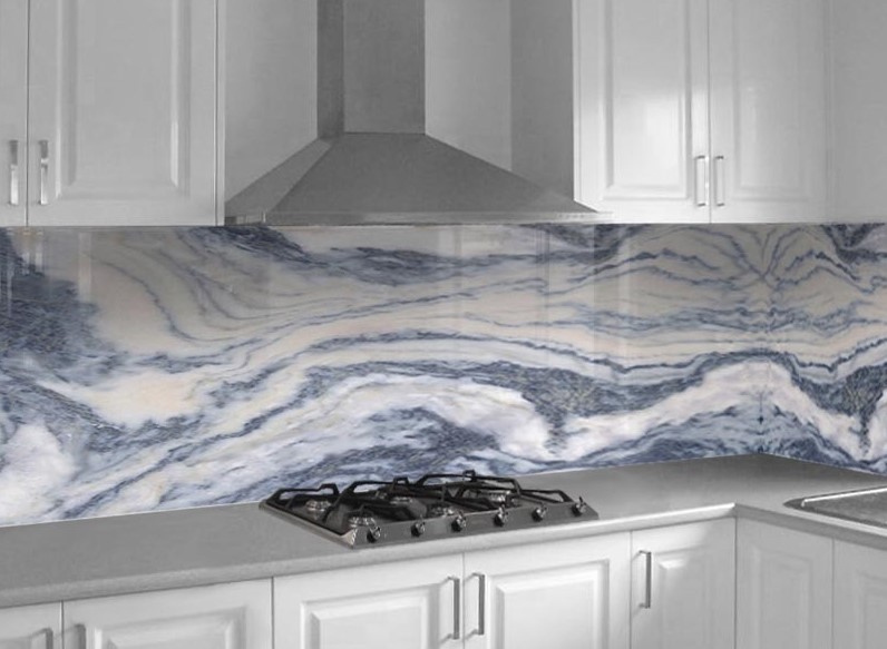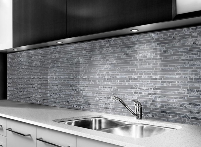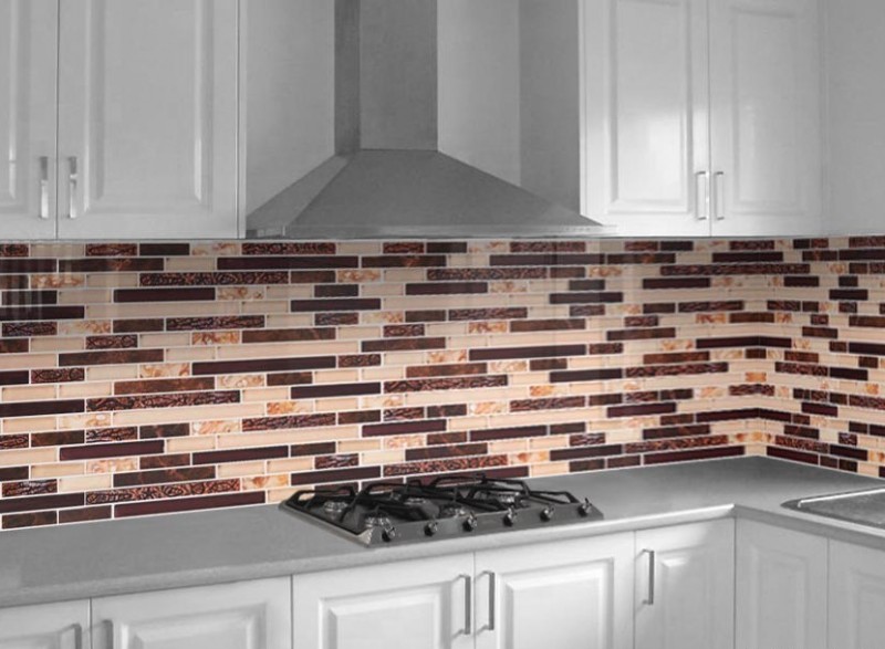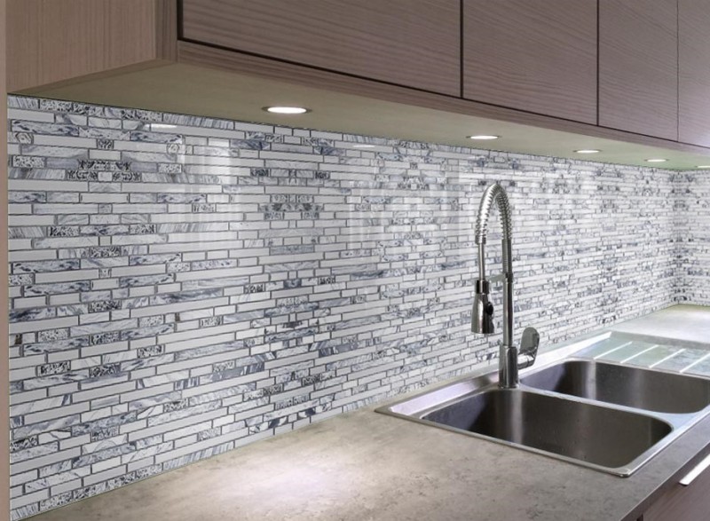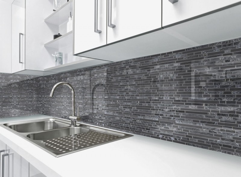 Skleněné obklady s imitací kamene jsou krásným moderním doplňkem každé kuchyně.