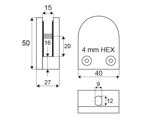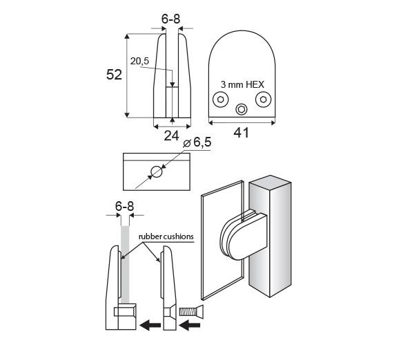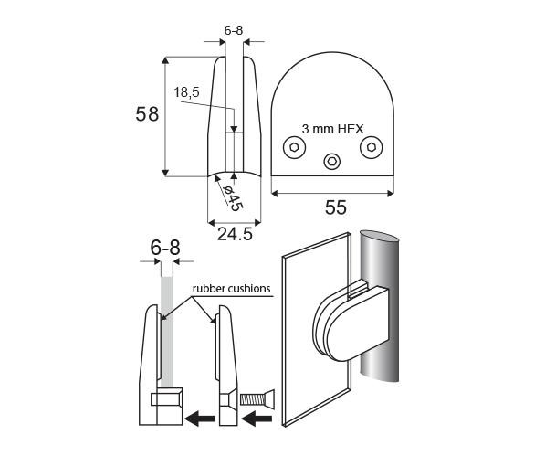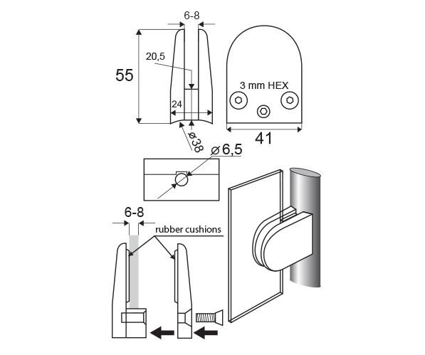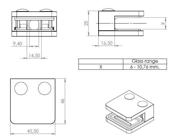 Určen pro tloušťku skla 6-10,76 mm. Vymezení tloušťky skla se provádí pomocí plastových podložek, které nejsou součástí balení a je nutno je objednat zvlášť.