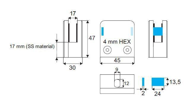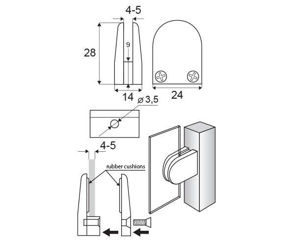 Nerezový držák skleněných tabulí je určen pro balkóny, zábradlí a police v interiérech i exteriérech s uchycením pro rovné sloupky s možností fixace skla pomocí přídavných čepů (nejsou součástí balení). Vyroben z nerez oceli 316.