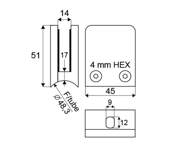 Nerezový držák skleněných tabulí je určen pro balkóny, zábradlí a police v interiérech i exteriérech s uchycením pro trubkový sloupek o ø 48,3 mm. Vyroben z nerez oceli 316.