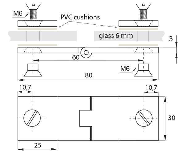 Závěs je určen pro skleněné vložené dveře bez nutnosti vrtání otvoru do skla a je dodáván v párech (horní a spodní). Možnost použití zátlačné kuličky pro fixaci v nulové poloze. Zátlačná kulička není součástí balení a je nutno ji objednat zvlášť.