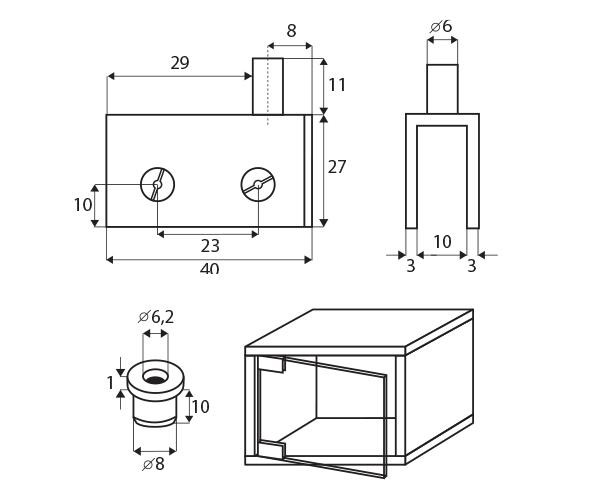 Obsah balení: závěs horní, závěs spodní, šrouby k uchycení skla, tlumící podložka